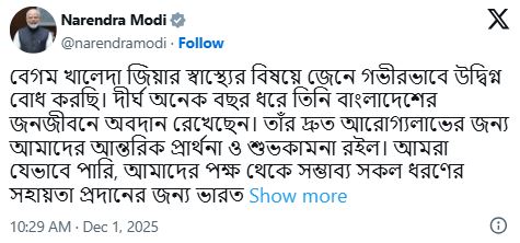 আজ সোমবার (০১ ডিসেম্বর) এক পোস্টে তিনি জানান, ভারত যে কোনোভাবে সম্ভাব্য সব ধরনের সহায়তা দিতে প্রস্তুত।সামাজিক যোগাযোগমাধ্যম এক্সে এক পোস্টে মোদি লেখেন, বেগম খালেদা জিয়ার স্বাস্থ্যের বিষয়ে জেনে গভীরভাবে উদ্বিগ্ন। বাংলাদেশের জনজীবনে বহু বছর ধরে তার গুরুত্বপূর্ণ অবদান রয়েছে। তার দ্রুত সুস্থতা কামনা করছি। ভারত সম্ভাব্য সব সহায়তা দিতে প্রস্তুত— যেভাবে পারি।এদিকে বিএনপির চেয়ারপারসন বেগম খালেদা জিয়ার চিকিৎসায় সহায়তা করতে