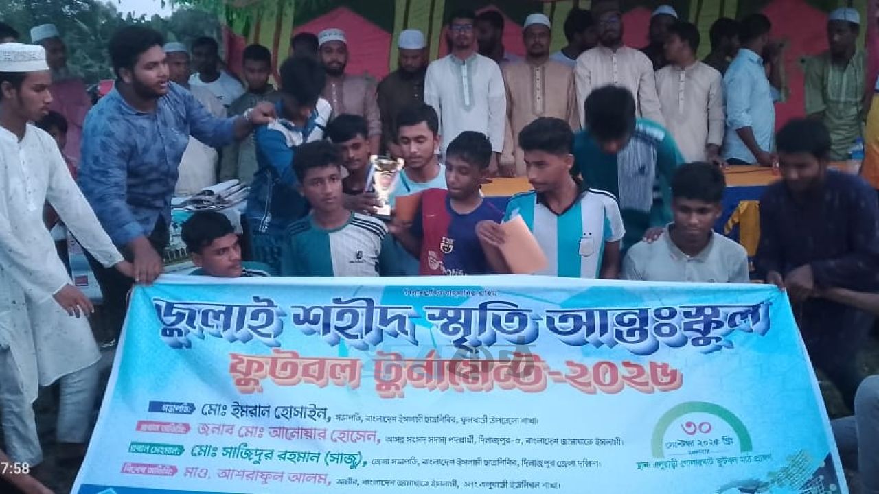 দিনাজপুরের ফুলবাড়ী উপজেলায় বাংলাদেশ ইসলামী ছাত্রশিবিরের আয়োজনে জুলাই শহীদ স্মৃতি আন্তঃস্কুল ফুটবল টুর্নামেন্ট অনুষ্ঠিত হয়েছে।