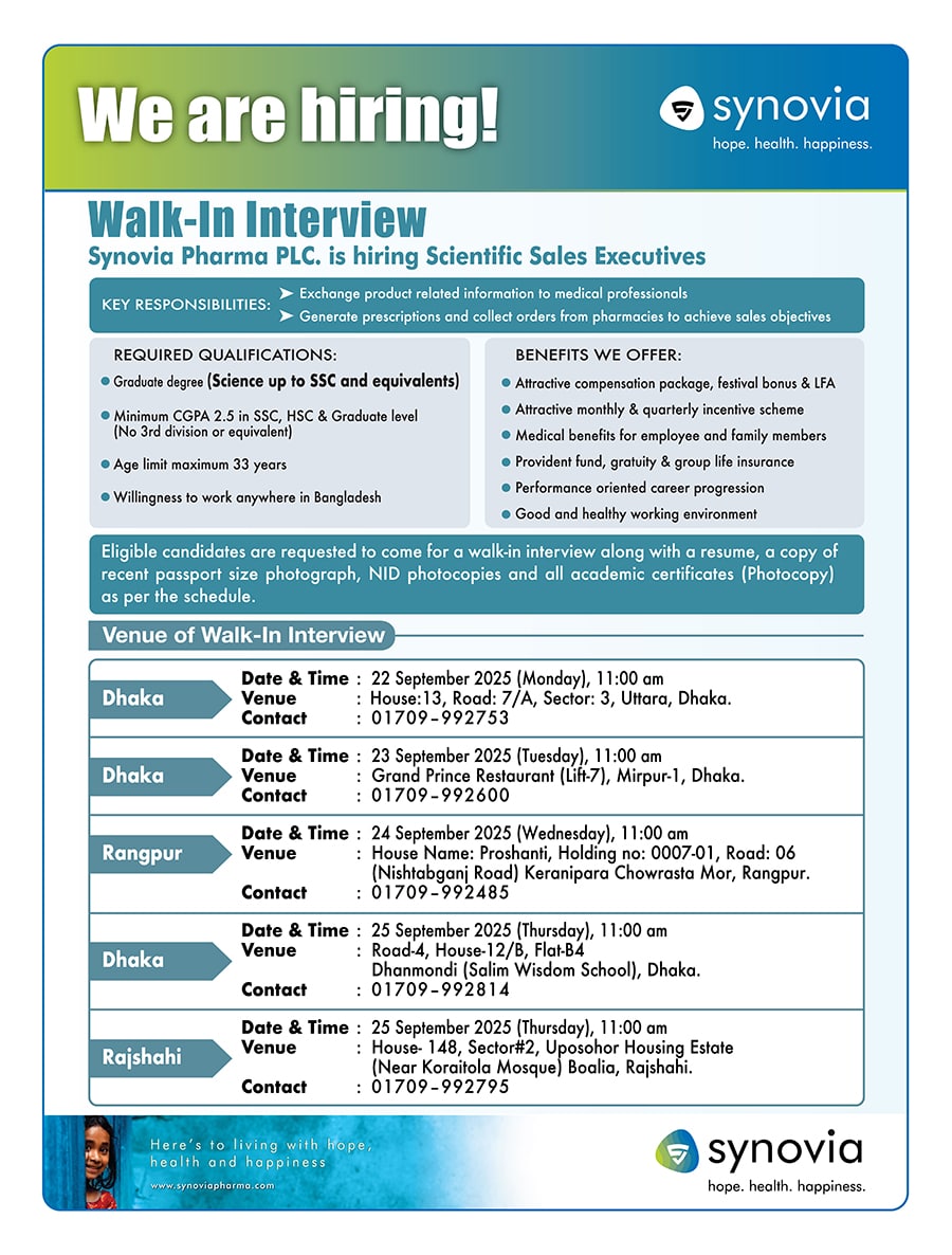 জনবল নিয়োগে বিজ্ঞপিত্ত প্রকাশ করেছে সিনোভিয়া ফার্মা । প্রতিষ্ঠানটি ‘সায়েন্টিফিক