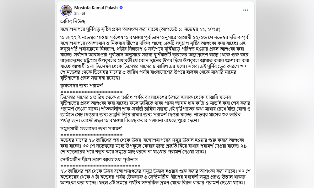 তিনি জানায়, বঙ্গোপসাগরে ঘূর্ণিঝড় সৃষ্টির প্রবল আশঙ্কা করা যাচ্ছে। এটি আগামী মাসের প্রথম সপ্তাহের মধ্যে আঘাত হানতে পারে। সামাজিক যোগাযোগ মাধ্যম ফেসবুকে দেওয়া এক পোস্টে তিনি বলেন, ‘আজ ২২ নভেম্বর পাওয়া সর্বশেষ আবহাওয়া পূর্বাভাস অনুসারে আগামী ২৫/২৬ নভেম্বর দক্ষিণ-পূর্ব বঙ্গোপসাগরে (আন্দামান ও নিকবার দ্বীপের দক্ষিণ পাশে) একটি লঘুচাপ সৃষ্টির আশঙ্কা করা যাচ্ছে। এই লঘুচাপটি পর্যায়ক্রমে নিম্নচাপ, গভীর নিম্নচাপ ও সর্বশেষে ঘূর্ণিঝড়ে পরিণত হওয়ার প্রবল আশঙ্কা করা যাচ্ছে।